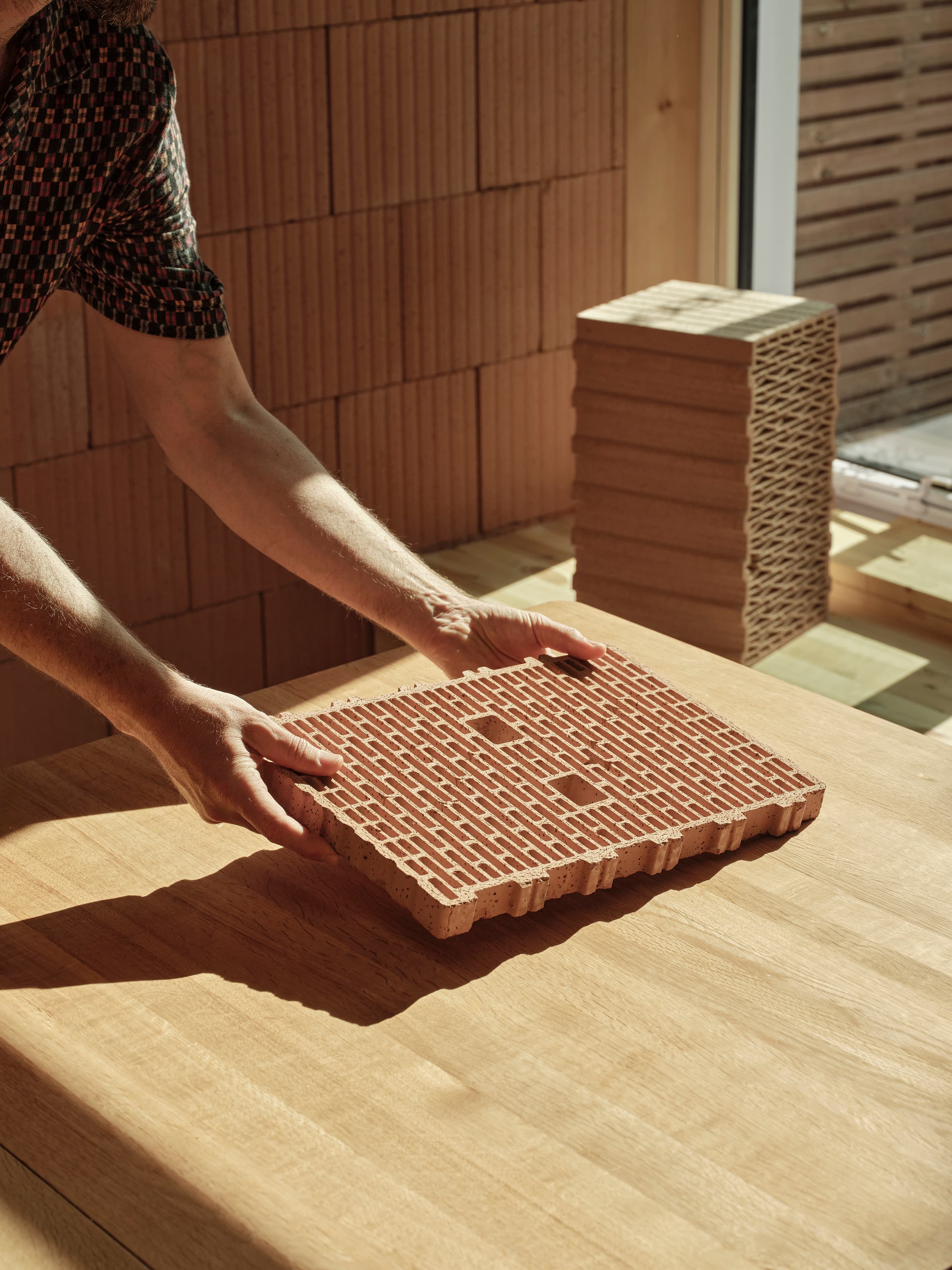 By building with Porotherm, we reduced the need for concrete, insulation, and internal linings. Its interlocking design simplified construction and helped minimise material use. Inside, the exposed blocks offer a raw, textural finish that complements the home’s original 1970s brickwork. Outside, we experimented with custom-cut tiles from the same blocks, reimagining their cellular form as a subtle decorative cladding.