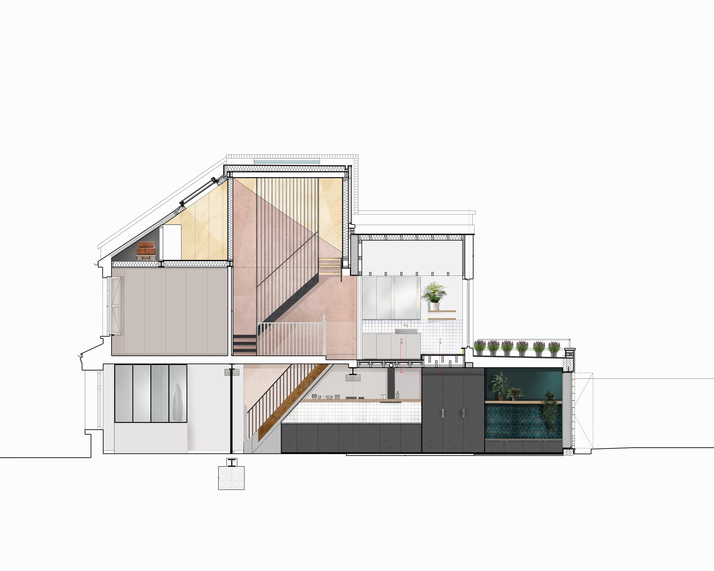 A series of contemporary interventions were added to the existing late-Victorian terrace house, crafted to be clearly identifiable in their adjacency with the original features. These new features were highlighted in black and green, including the expressed steel work, galley kitchen, and painted modifications to the existing staircase.