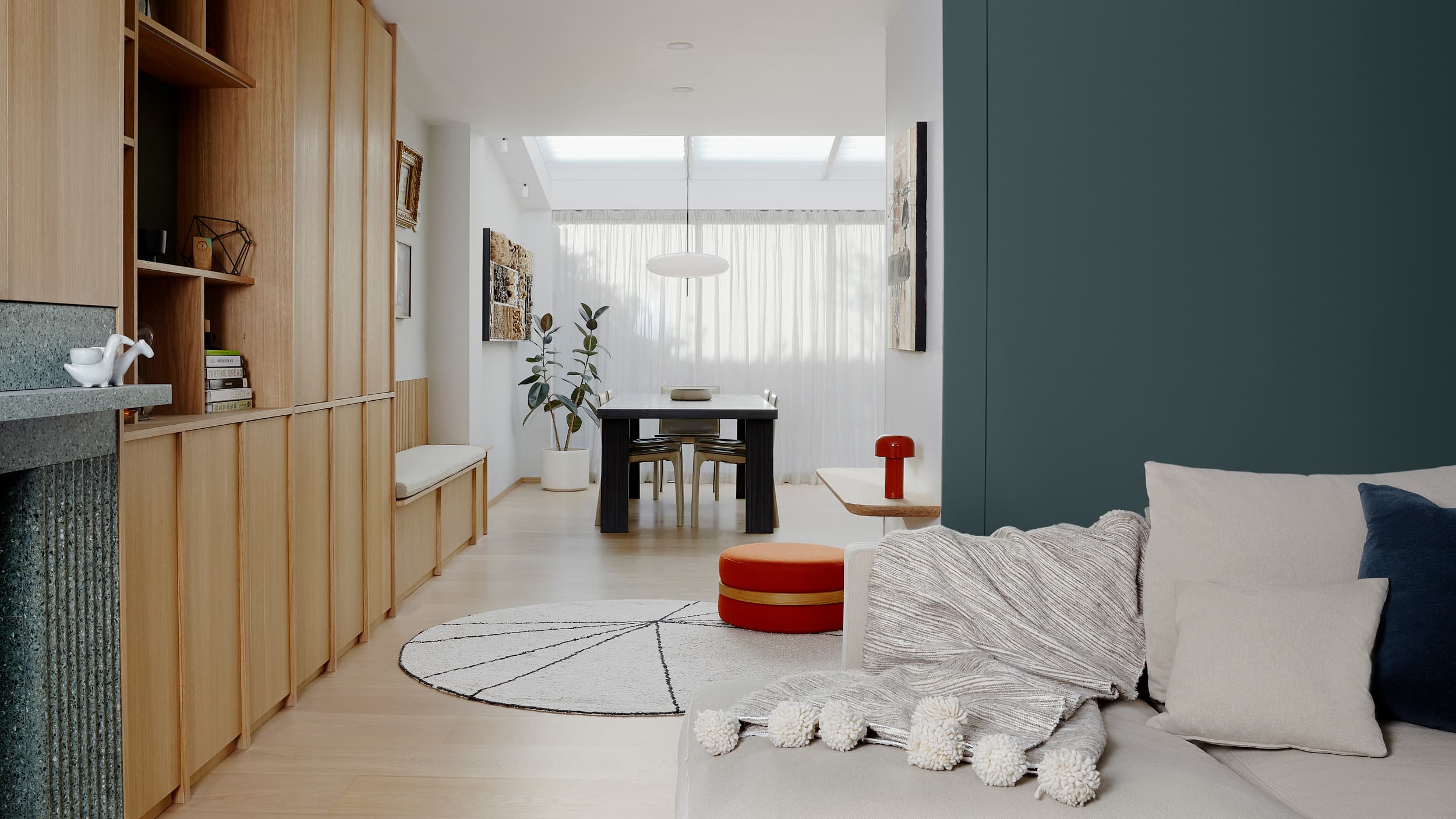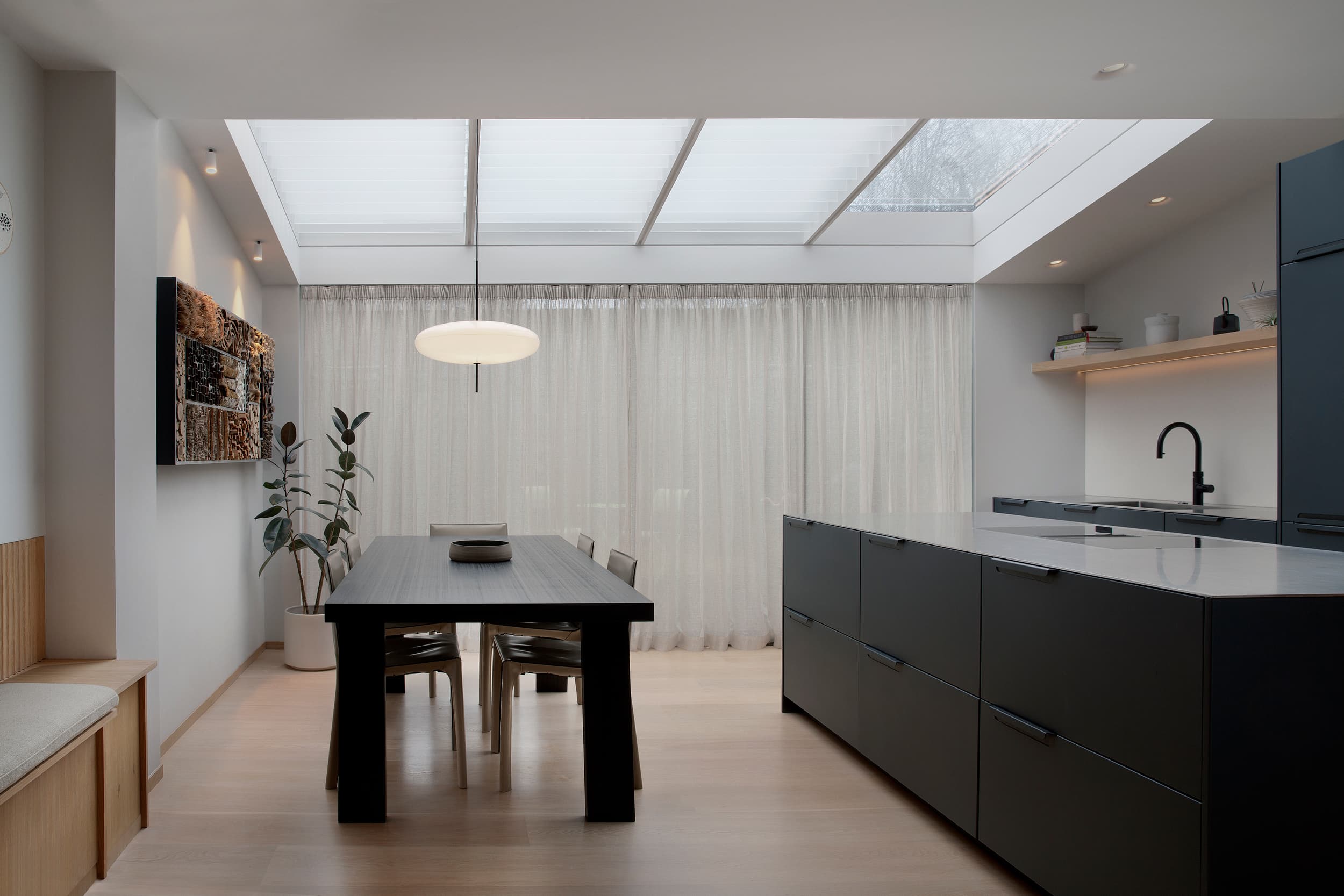 An exploration of raw materials was used to introduce subtle colour, including - oak, stainless steel and undyed linen. Bespoke joinery throughout the house articulates the spaces by bring functional and discreet storage to each room.