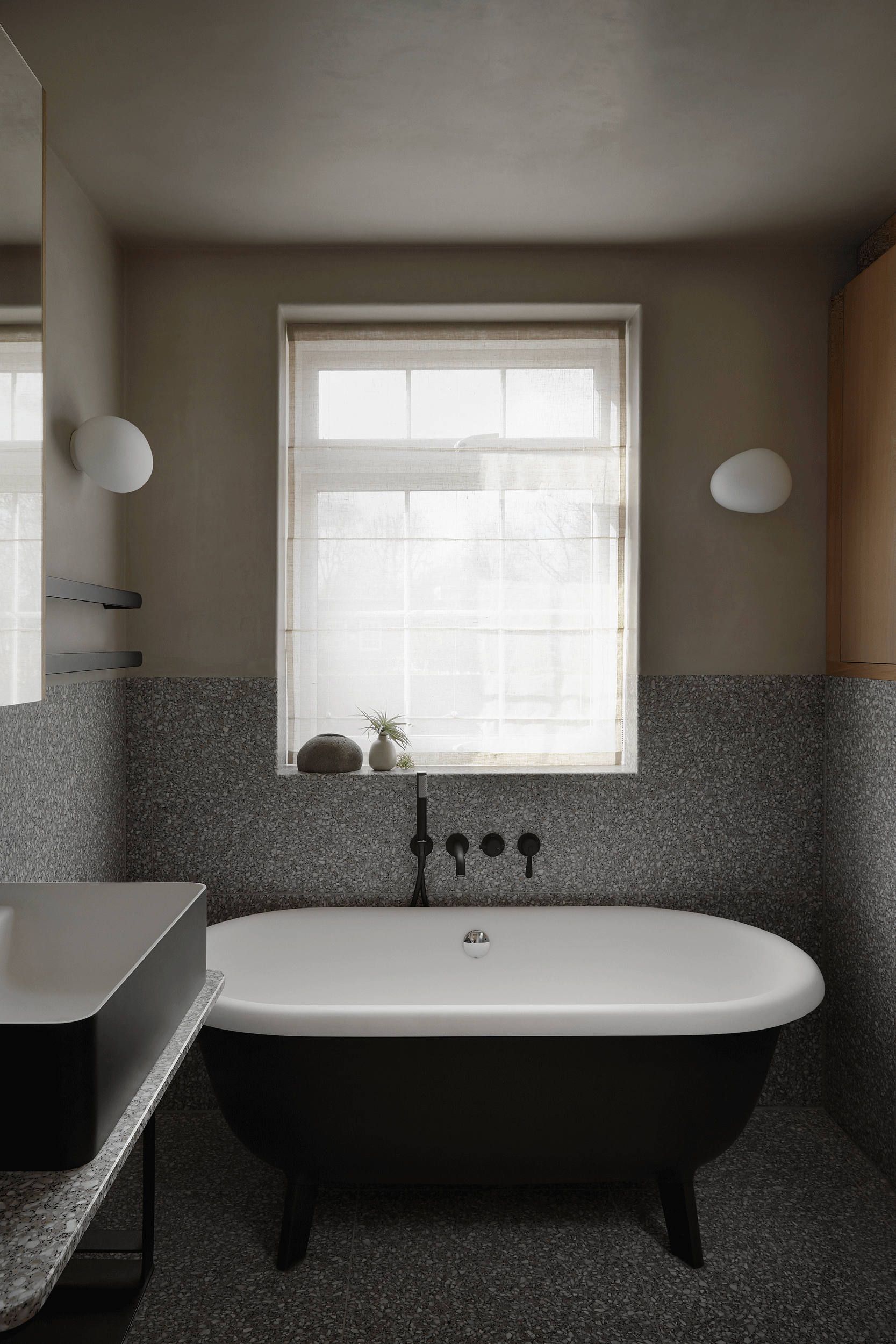 As part of a complete structural rethink of the interior space, the design repositioned the central stairwell to eliminate awkward, unusable areas from the hallway and landing. This found space created an opportunity to integrate an additional bathroom on the ground floor. A conical form cuts up into the roof, drawing in a wonderful quality of natural light into the centre of the house. Intersecting through the children’s bedroom, it creates a soft curve into an otherwise linear set of spaces.