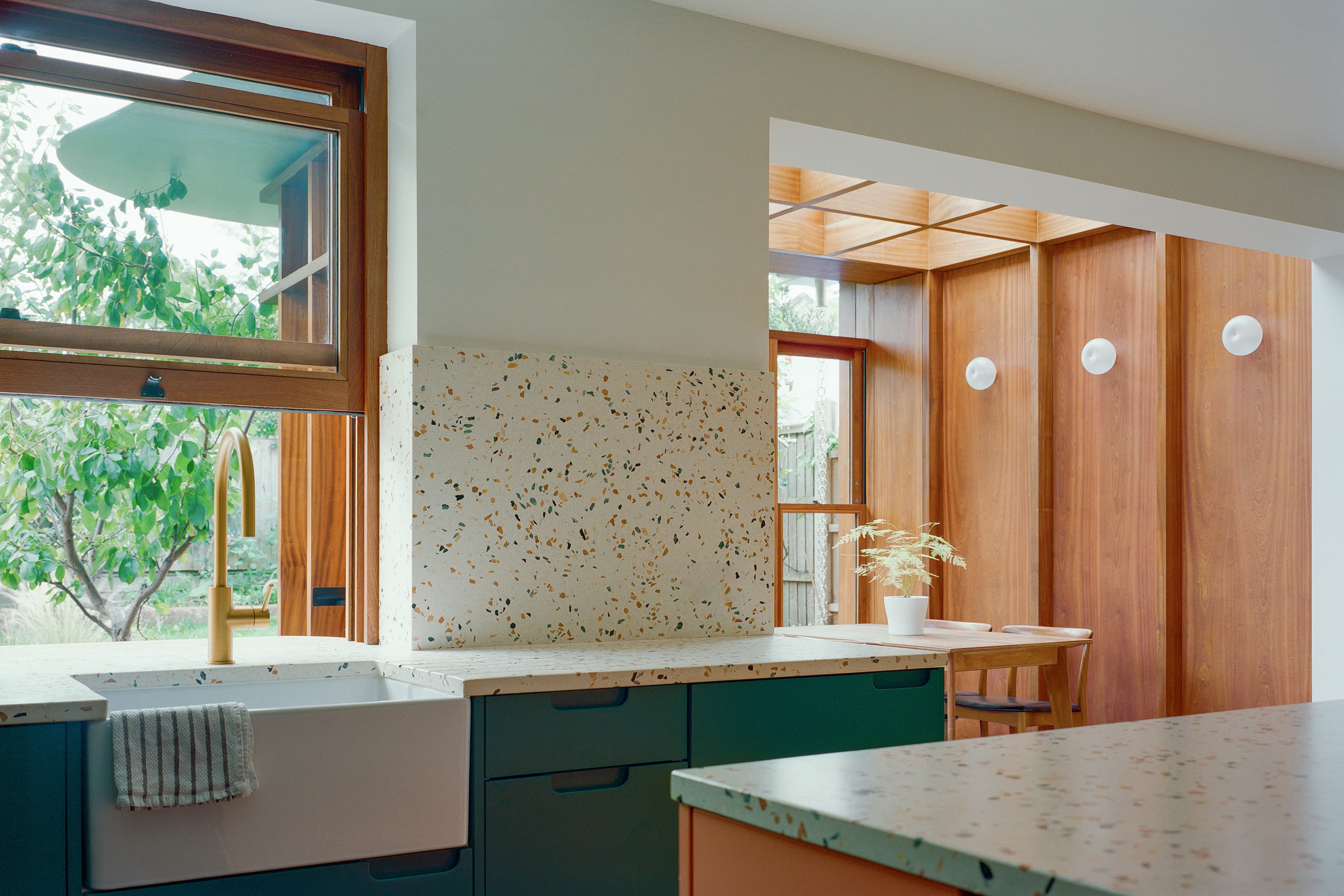 The new kitchen is characterised by a playful use of colour and terrazzo worktops. The addition of a servery window further supports a close connection to the garden, allowing a seamless transition of food and drink between the kitchen and a new patio area outside.